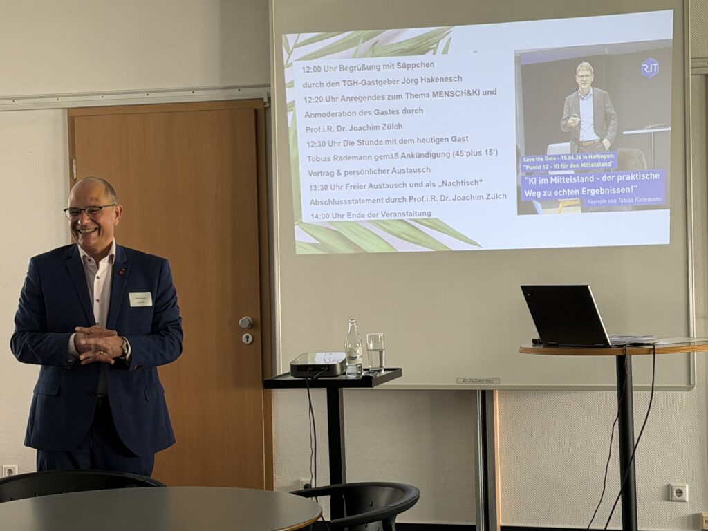 🎤 In seiner Keynote „KI im Mittelstand – der pragmatische Weg zu echten Ergebnissen“ gab Tobias Rademann (R.iT GmbH, Bochum) wertvolle Einblicke aus über 25 Jahren Erfahrung in der digitalen Transformation. Seine klare Botschaft: KI ist kein Selbstzweck – entscheidend ist der konkrete Nutzen für Unternehmen.